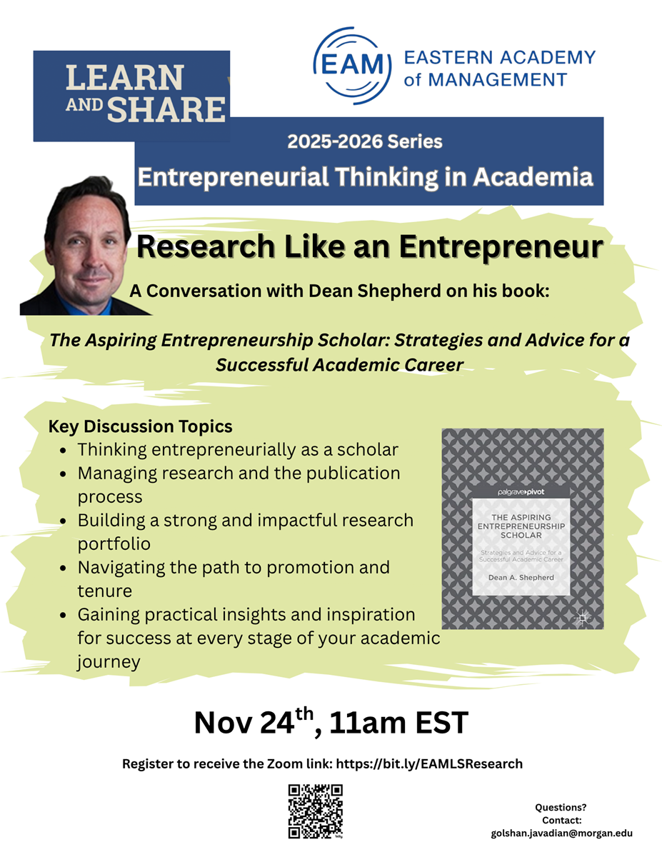 Join us for an Eastern Academy of Management Learn and Share session with Dean Shepherd, author of The Aspiring Entrepreneurship Scholar. ππ‘