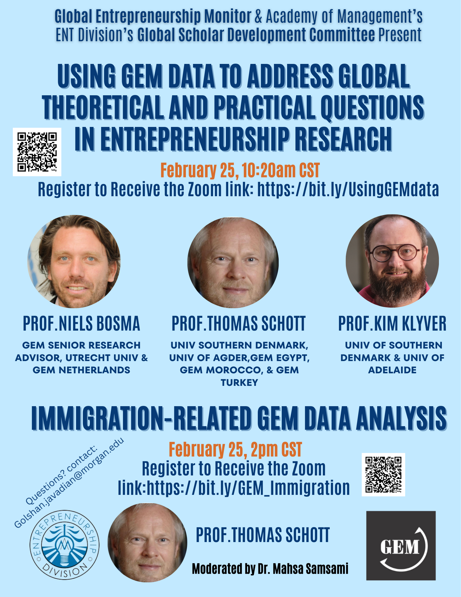 ππ Global Entrepreneurship Monitor(GEM) and AOM ENT Divisionβs Global Scholar Development Committee are hosting two virtual sessions on using GEM data in entrepreneurship research: